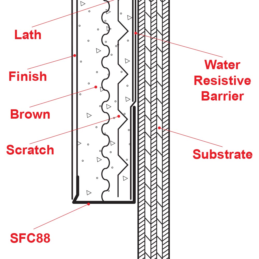 The latest addition to our new "Finish Rite™" line of plaster trims, the SFC88 Short Flange casing bead solves the problem of controlling the brown coat thickness in a 3 and 4 coat system to exactly the 3/4" depth required by providing a special screed leg at this depth. 1/8" key holes provide good keying of the brown coat to the trim piece to help prevent separation cracking and delamination. The SFC88 Short Flange saves time, material costs and increases production rates not to mention a crack-free finish. No more excessive plaster build up! Control your finish, control your cost! Special sizes available. Please contact us for more information.
